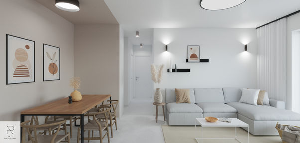 הדמיות לחלל מגורים, פינת אוכל ומטבח בדירה פרטית, הכוללת עיצוב מלא בהתאם לבקשת הלקוח.